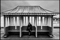 a black and white photo of a girl sitting in front of a sign that says cream