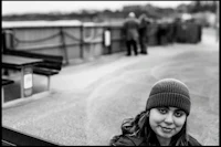 a black and white photo of a girl wearing a beanie
