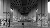 black and white photograph of a person walking on the beach